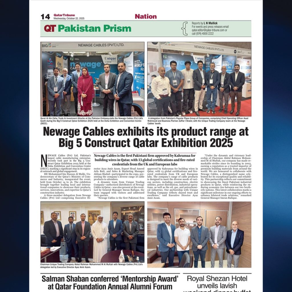 Newage Cables featured in Qatar Tribune showcasing Pakistani excellence at The Big 5 Construct Qatar 2025